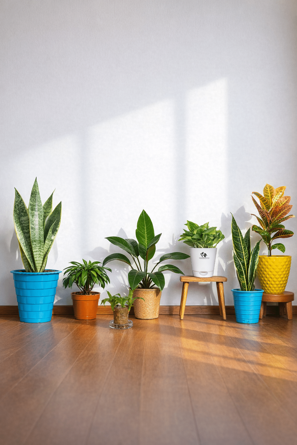 A soothing indoor corner featuring multiple snake plant varieties thriving in natural light — perfect for creating a refreshing and
